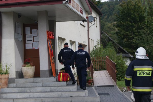 o podłożonym w budynku Urzędu Gminy Tyrawa Wołoska ładunku wybuchowym oraz podłożony ogień w pomieszczeniach piwnicy budynku. O fakcie tym zostały natychmiast powiadomione służby dyżurne Komendy Powiatowej Państwowej Straży Pożarnej w Sanoku, Komendy Powiatowej Policji w Sanoku oraz Bieszczadzkiego Pogotowia Ratunkowego